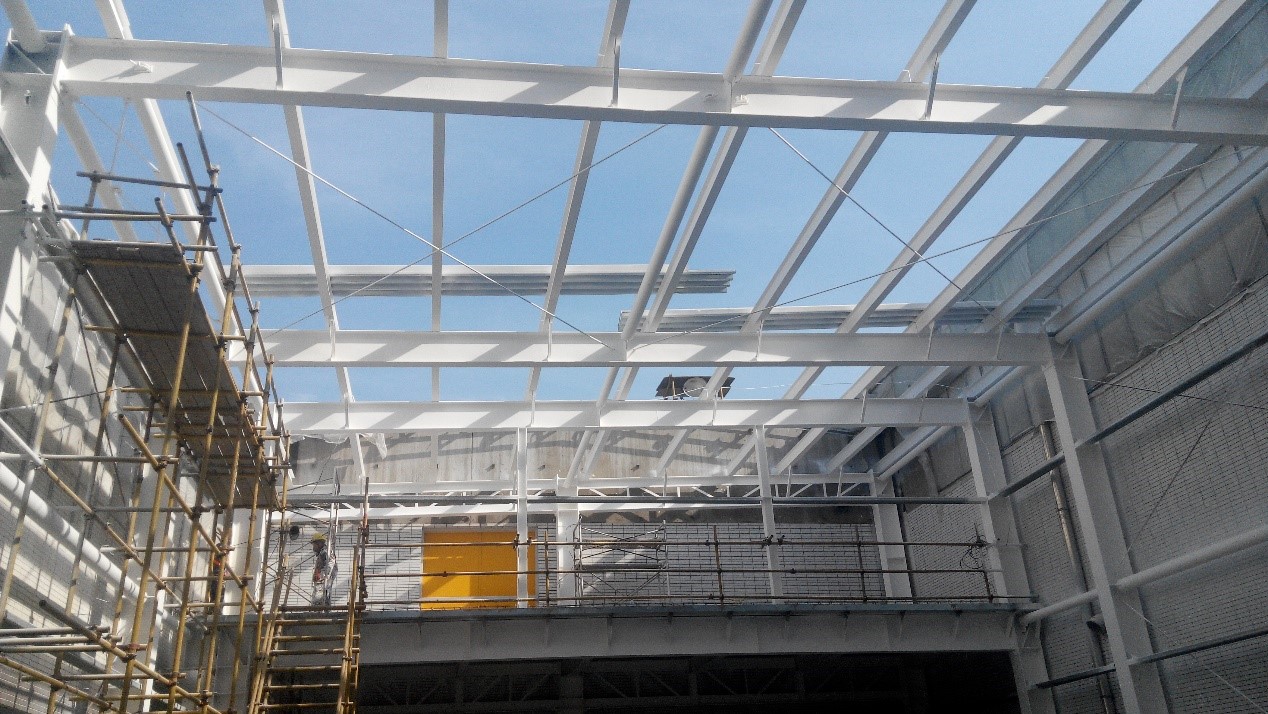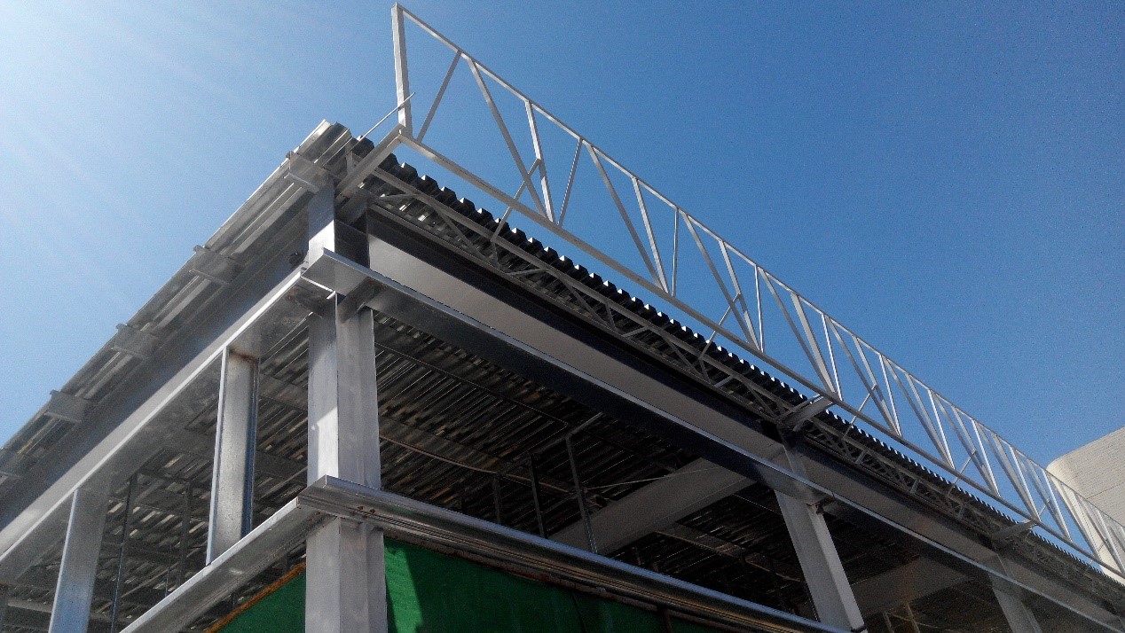 綜合擴建項目的鋼結構工程施工。工程由臨時辦公樓、3C號建筑(冷庫)、3A號建筑(庫房)、3B號建筑(無人機械庫房)、120號建筑(空中連廊)、3號建筑(取樣間)等六個子項構成,鋼材用量約600t。