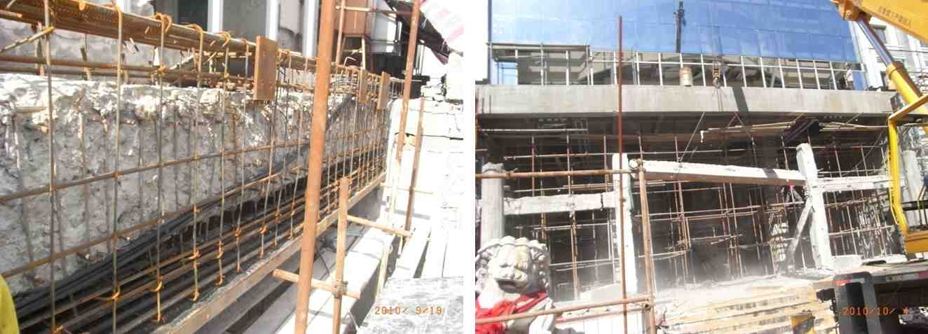 拔柱改造加固工程,將原框架結(jié)構(gòu)首層~設(shè)備層中間原扶梯洞口處兩根框架柱拔出,形成首層12m×12m跨度大空間。